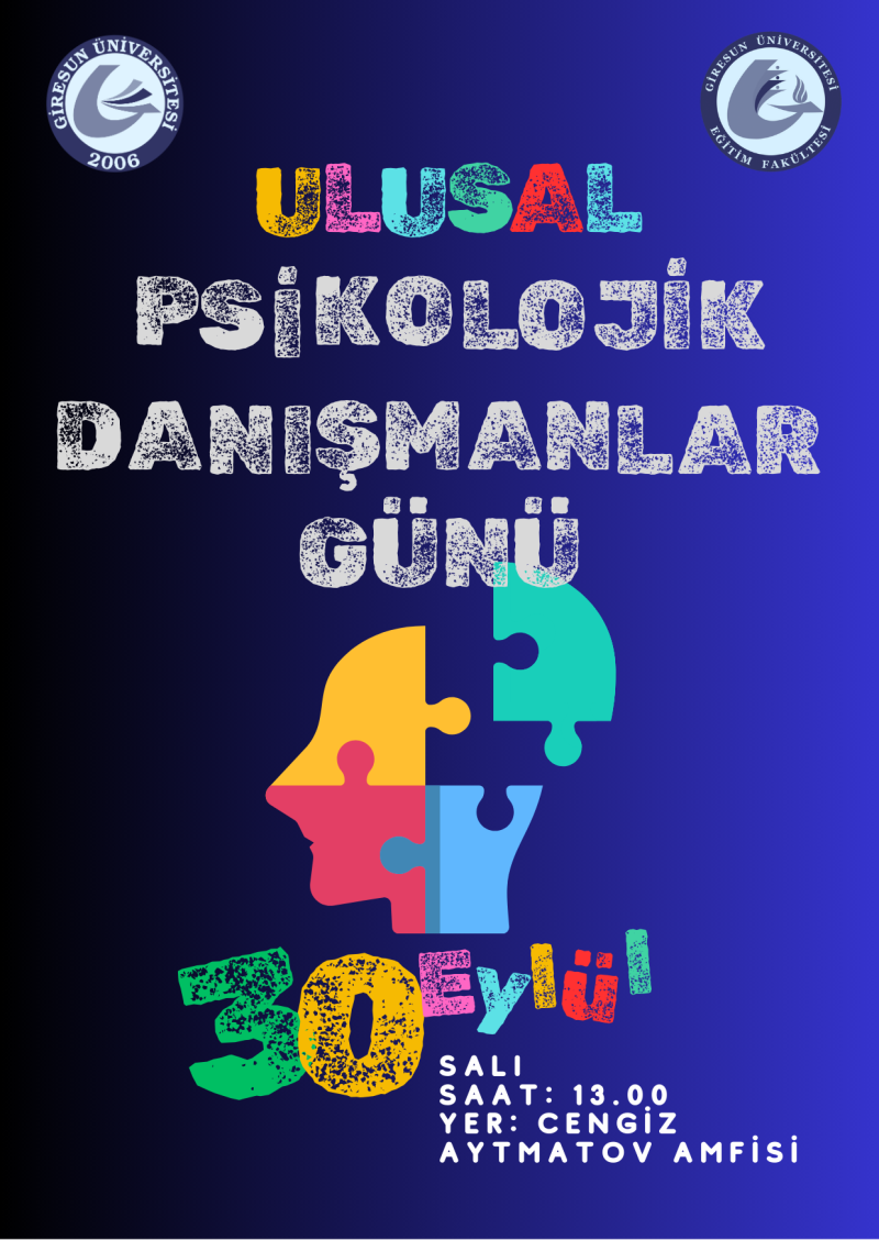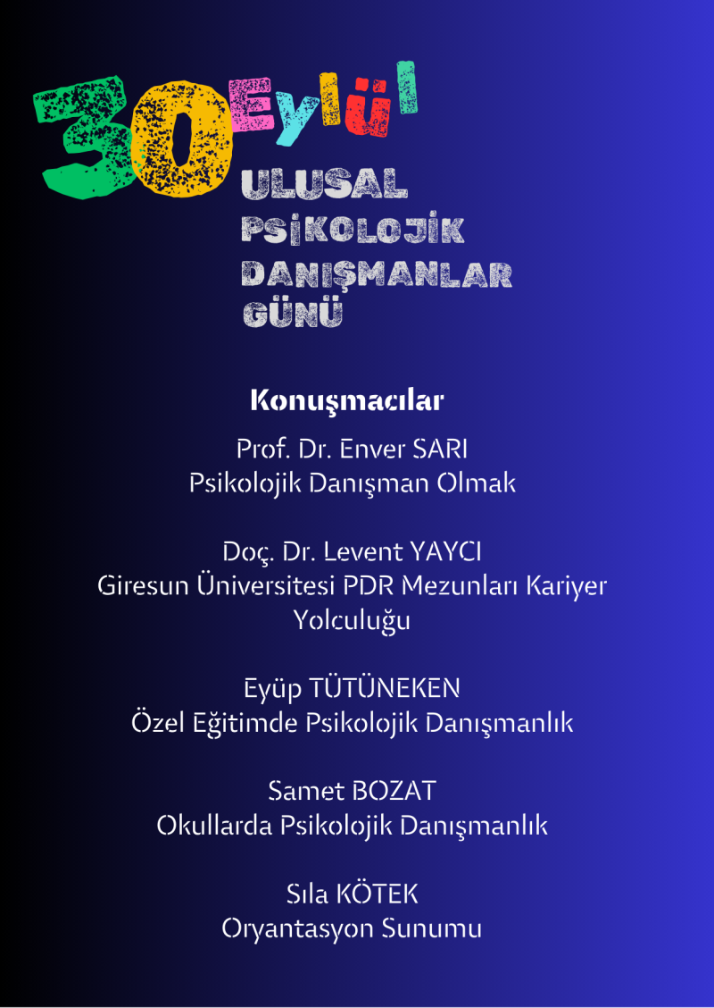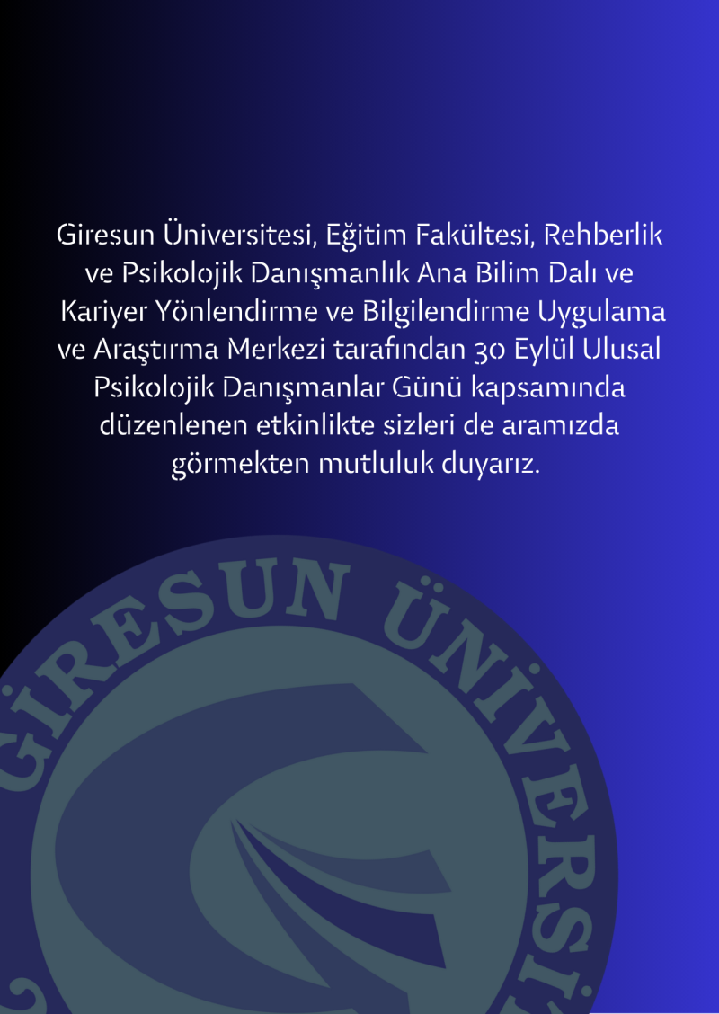 Giresun Üniversitesi, Eğitim Fakültesi, Rehberlik ve Psikolojik Danışmanlık Ana Bilim Dalı tarafından 30 Eylül Ulusal Psikolojik Danışmanlar Günü kapsamında düzenlenen etkinliğe davetlisiniz.